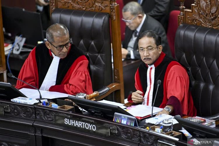 TIMES Kendari/Ketua Mahkamah Konstitusi (MK) Suhartoyo (kanan) bersama Wakil Ketua MK Saldi Isra memimpin sidang pengucapan putusan perkara dilanjutkan atau tidak (dismissal) sengketa Pilkada 2024 di Gedung Mahkamah Konstitusi, Jakarta, Rabu (5/2/2025). (ANTARA)
