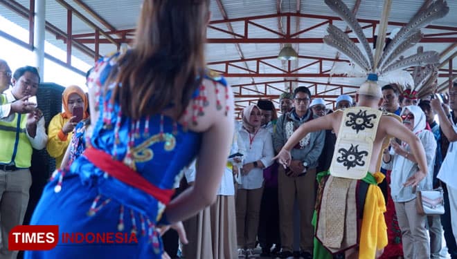 TIMES Kendari/Cawapres Nomor urut 02, Sandiaga Salahuddin Uno disambut dengan upacara adat Tetek Pantan saat tiba di Bandara Tjilik Riwut Palangkaraya, Kalimantan, Senin (04/02/2019). (FOTO: Tofik For TIMES Indonesia)