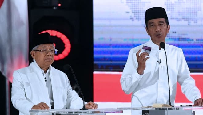TIMES Kendari/Pasangan capres-cawapres nomor urut 01 Joko Widodo (kiri) dan Ma'ruf Amin mengikuti debat kelima di Hotel Sultan, Jakarta, Sabtu (13/4/2019). (FOTO: Wahyu Putro A/Antarafoto)
